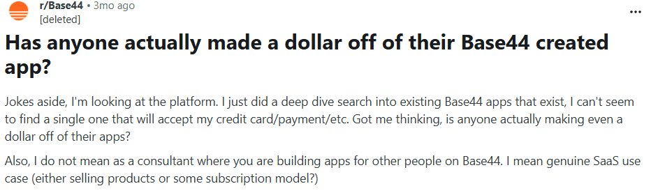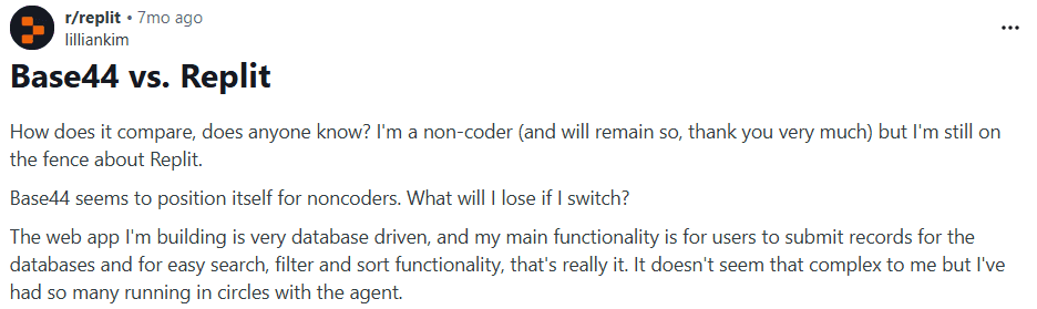 Reddit discussions often surface practical frustrations and real-world experiences that do not always appear on review platforms. Below are recent threads relevant to Base44 vs Replit.