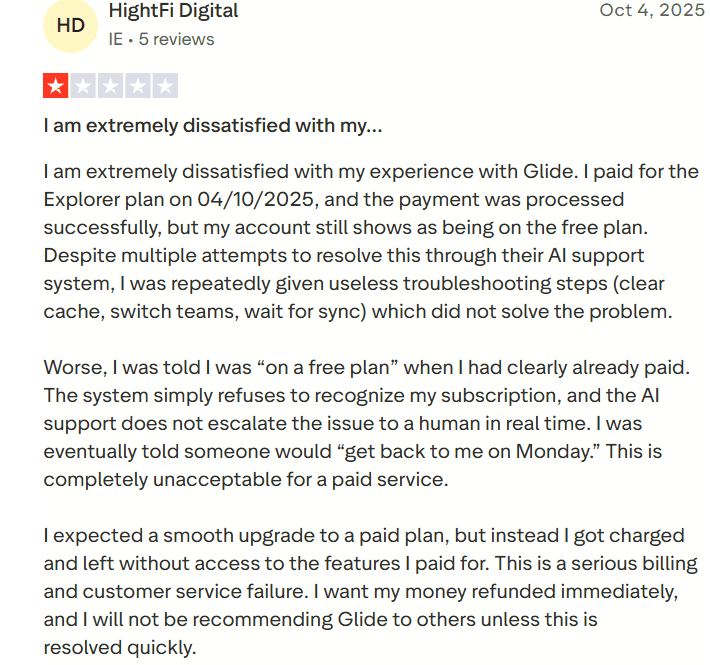 Several real customers express frustration with Glide’s customer support and billing processes. In multiple Trustpilot reviews users describe situations where they paid for a plan and features did not unlock as expected, or where support responses were slow and unhelpful. One reviewer reports paying for a business plan only to have their account still show a free plan, and repeated interactions with support yielded no immediate resolution.