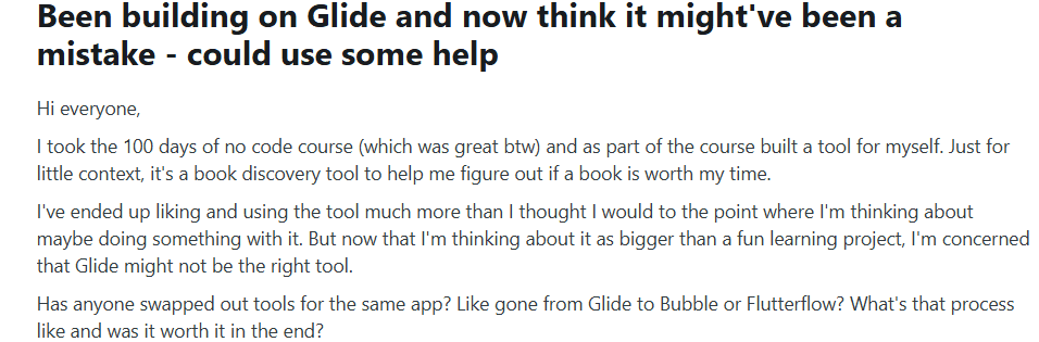 Makers report that Glide feels great for quick prototypes but becomes restrictive once an app needs to scale to real production use.
