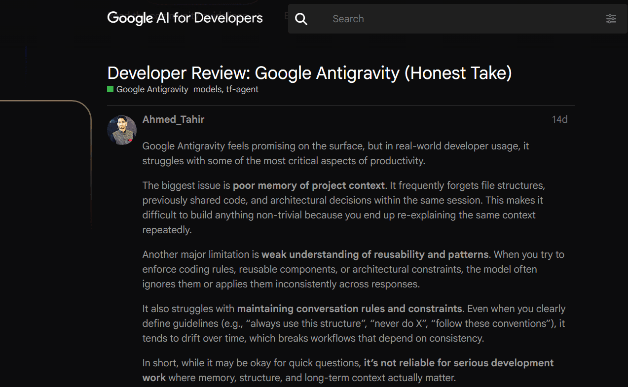 Developers report that Google Antigravity frequently forgets project structure, prior code, and architectural decisions, ignores reusable patterns and constraints, and drifts from defined rules over time, making it unreliable for building non-trivial, production-grade applications.