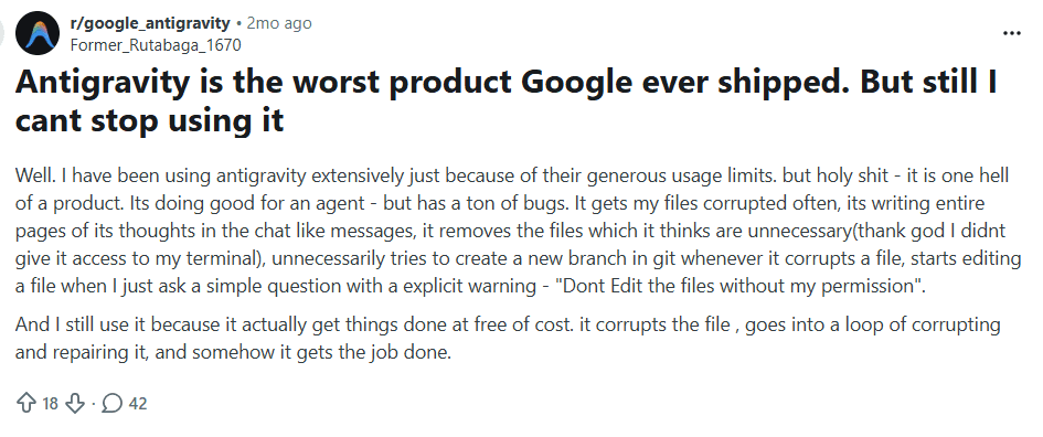 Google Antigravity is a fascinating experiment that demonstrates the creative potential of AI, but it is not designed for building practical, scalable, or maintainable products. Its value lies in entertainment and exploration, not in long-term application development.