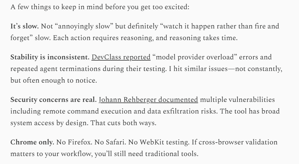 Users report that each action is painfully slow, stability is inconsistent with frequent provider overload errors and agent terminations, and documented vulnerabilities (including remote command execution and data exfiltration risks) raise serious concerns for using it in real production workflows.