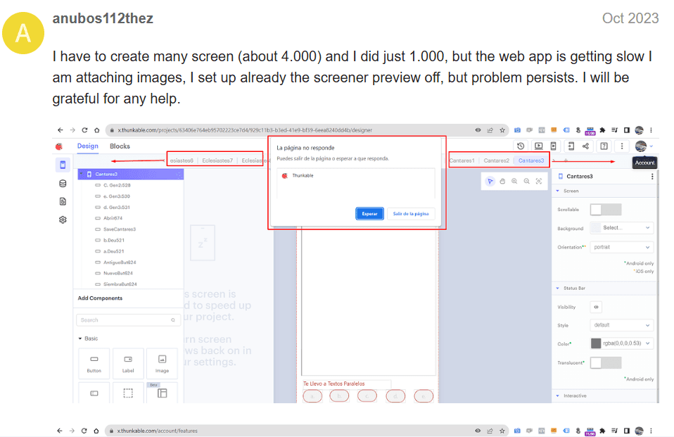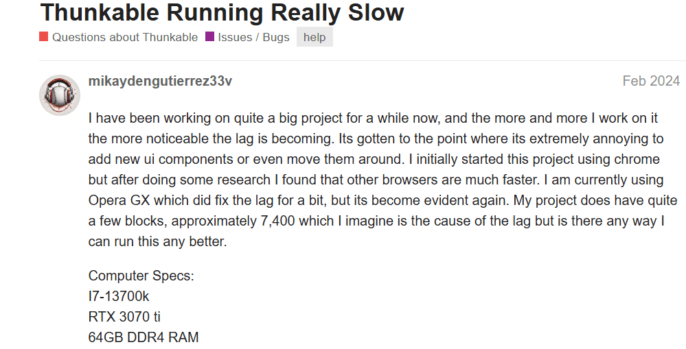 Users report that Thunkable’s drag-and-drop interface becomes slow and unresponsive as projects grow, making basic actions feel laggy even on strong hardware.