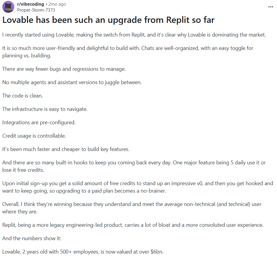 Lovable is viewed as a fast MVP engine rather than a traditional dev platform.