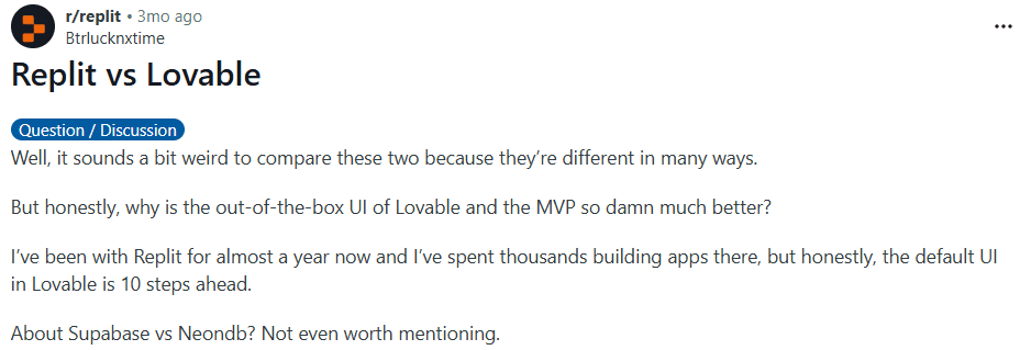 Here are three recent discussions comparing Lovable and Replit directly from Reddit.