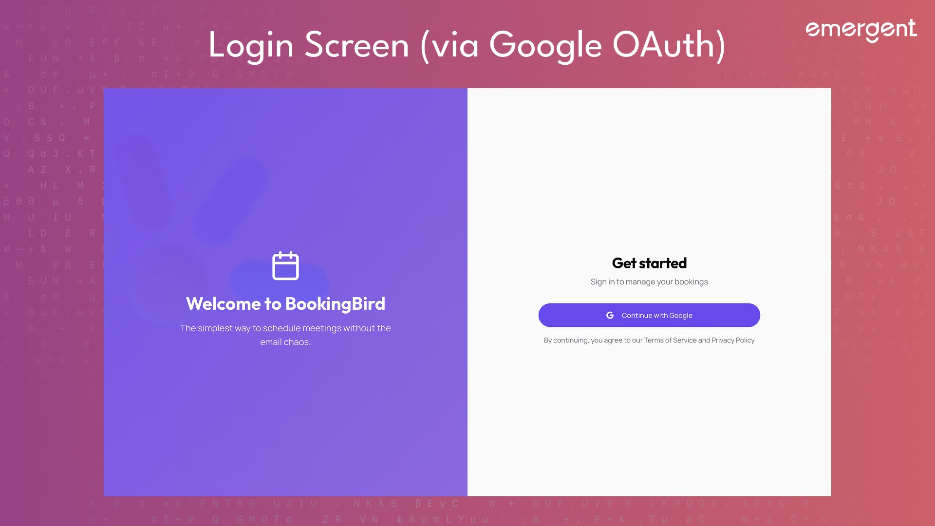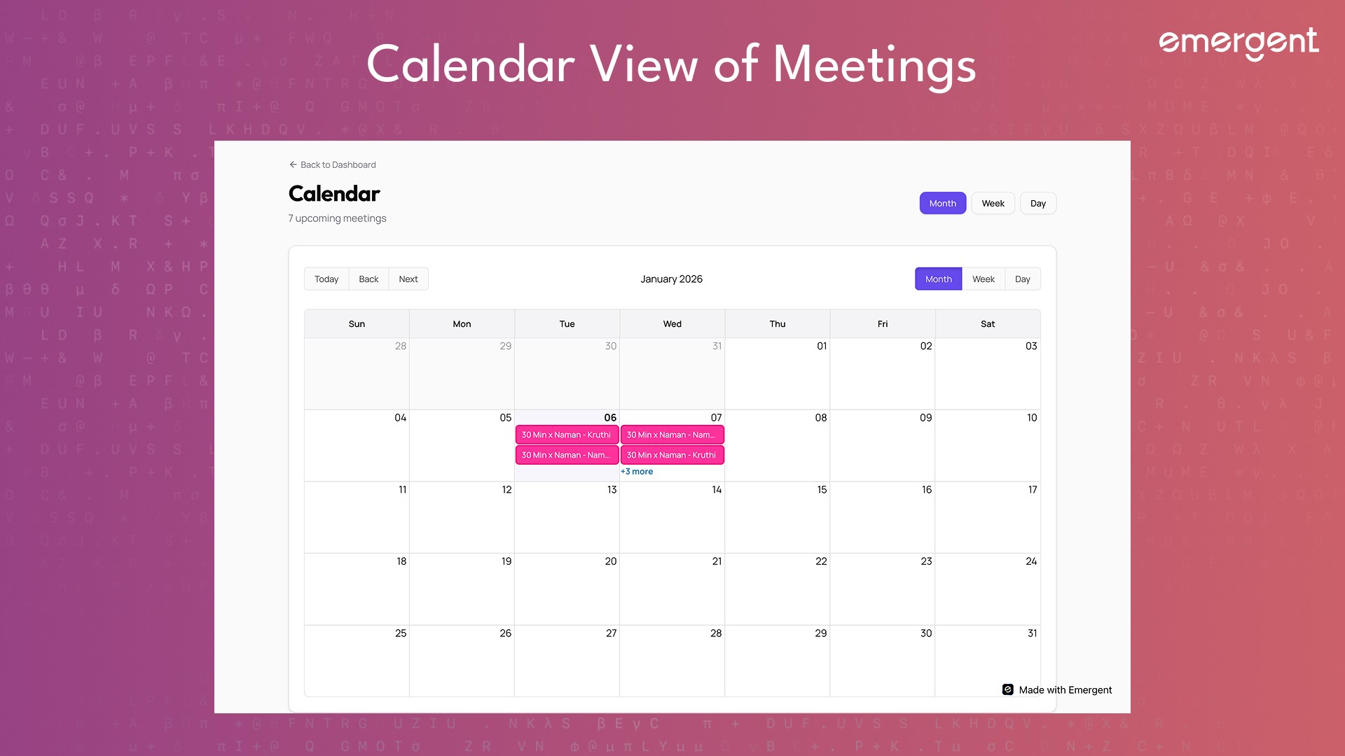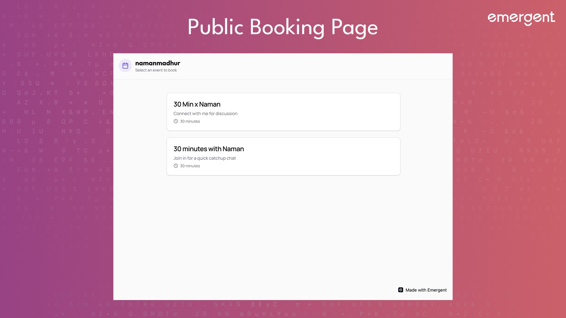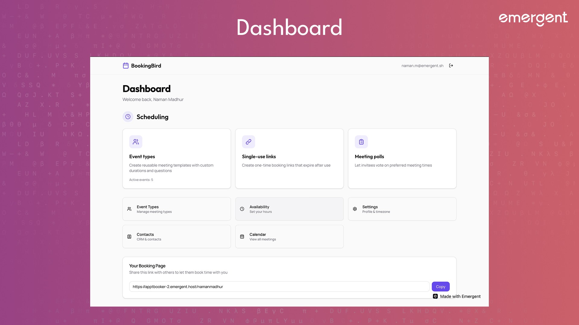 A Calendly-style scheduling app that lets hosts define availability, create event types, and share booking links, with meetings and confirmations handled automatically end to end.