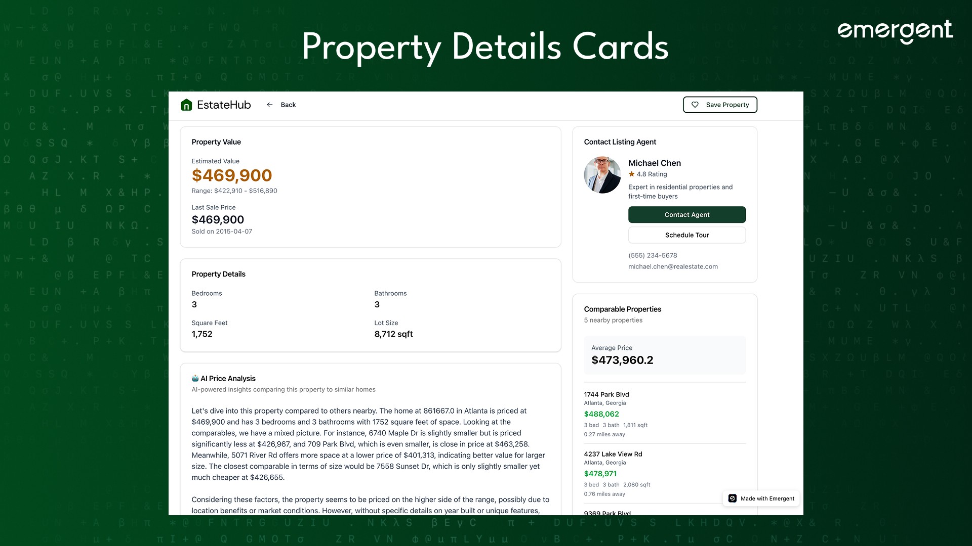 EstateHub is a modern, Zillow-style real estate discovery platform built using Emergent. It shows how a visually rich, marketplace-style application can be created from prompts without sacrificing design quality, usability, or user trust.