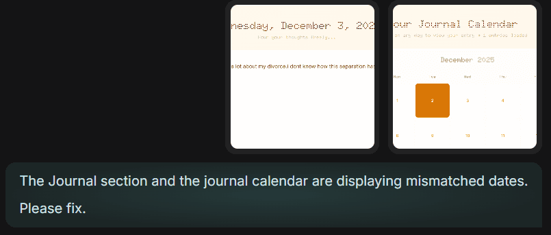 ✅ Calendar Date Consistency: Does a journal entry saved for today's date appear on the correct day in the calendar view (not off by one day due to timezone)?