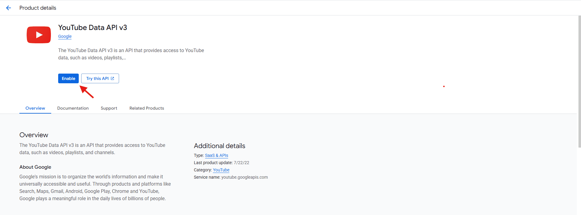 YouTube Data API v3Click on "YouTube Data API v3" from the results