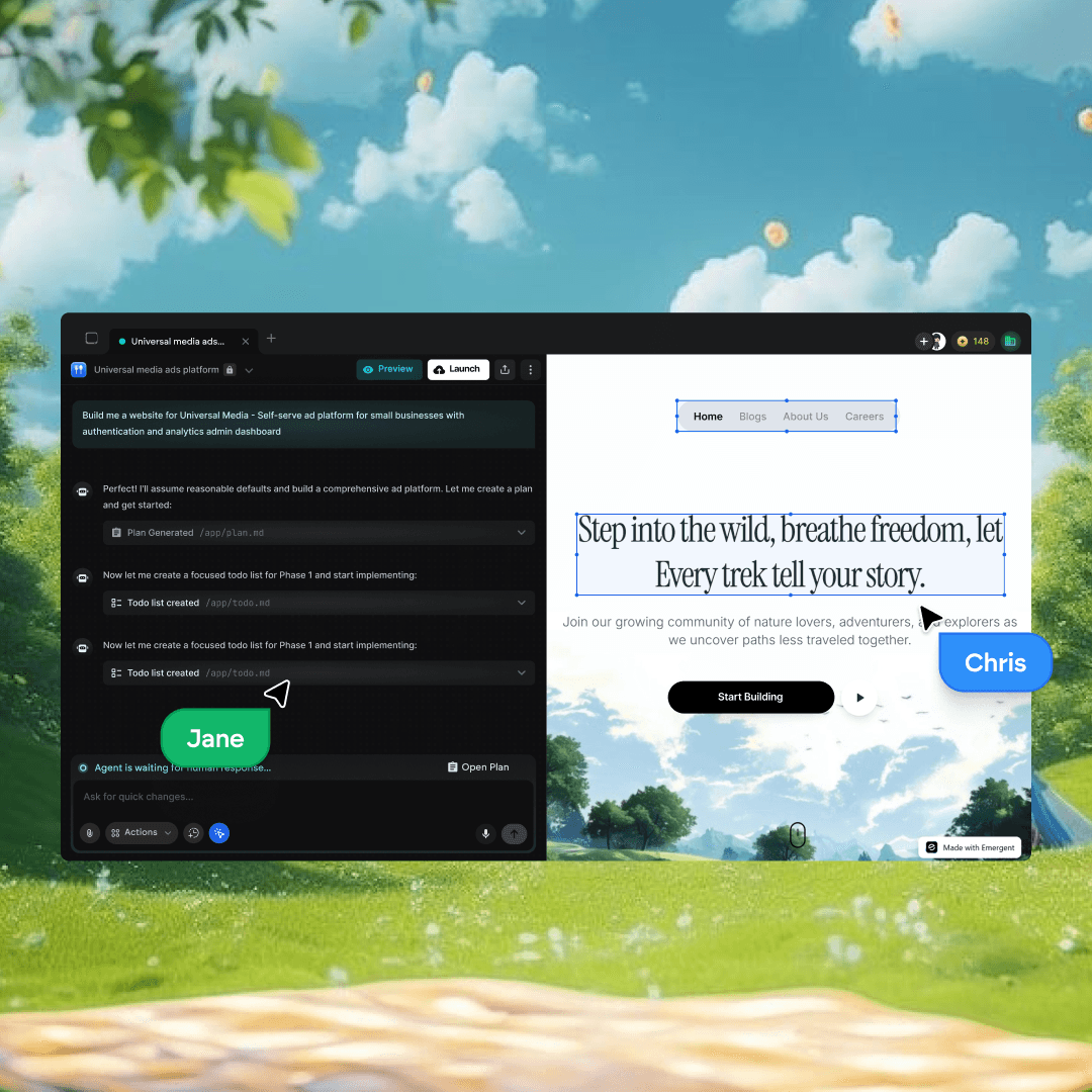 Emergent includes auth, database, payments, hosting, and mobile apps out of the box. No infrastructure to configure, no services to wire.